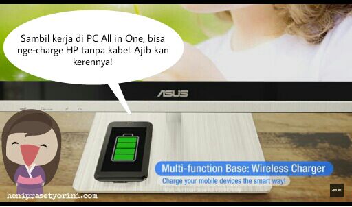 Pernah kagum dengan charger henpon wireless atau tanpa kabel? nah ini dia, di ASUS V200IB bisa dilakukan loh. Kita lagi kerja pake komputer kompak ini, sambil sekalian nge-charge henpon. Nggak pake repot, nggak pake kabel dan beneran meja kita jadi rapi jali. fiuuh, canggih banget sih ASUS..